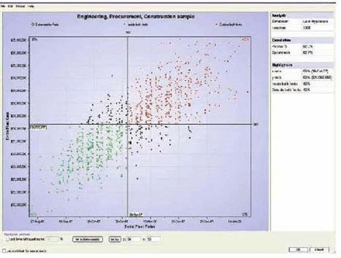 Người dùng có thể sử dụng loại báo cáo này để xác định xác suất kết hợp đạt được ngân sách và thời điểm hoàn thành dự án, đồng thời thực hiện phân tích kịch bản giả định (what-if analysis) bằng cách tương tác điều chỉnh các ngưỡng chi phí và tiến độ nhằm làm rõ khả năng thành công tương ứng.